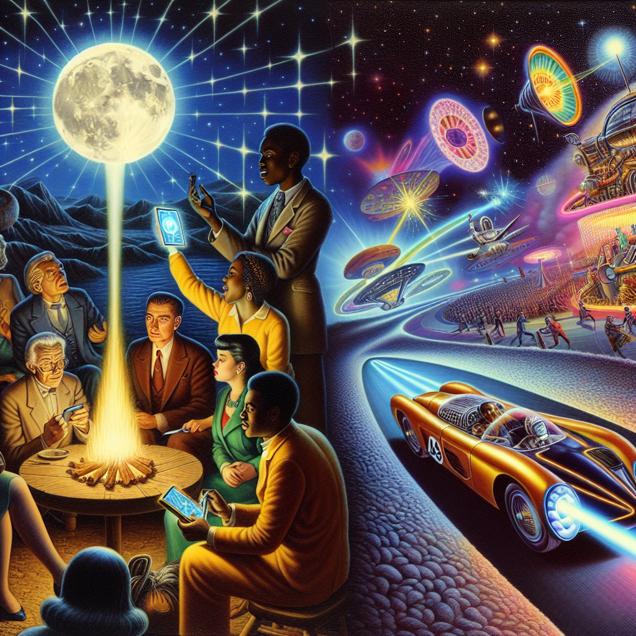 Prompt: Visualize a surrealist interpretation of a night sky filled with stars and a glowing full moon illuminating the scene. Below, a group of people are gathered around a bonfire, engaged in deep conversation. One person holds up a futuristic gadget, its glow illuminating their face as they intently interact with it. In the distant background, a surreal race track materializes, with an otherworldly vehicle racing around it. The driver exudes an aura of superhuman ability, hinting at unmatched performance. The two seemingly disparate scenes are interconnected by a palpable and enigmatic energy that transcends logic, inviting viewers to ponder the unexplained link between the search for daylight savings time and the extraordinary feat at the race track. The depiction should include only scenes, people, and objects, it should not include text or speech bubbles.