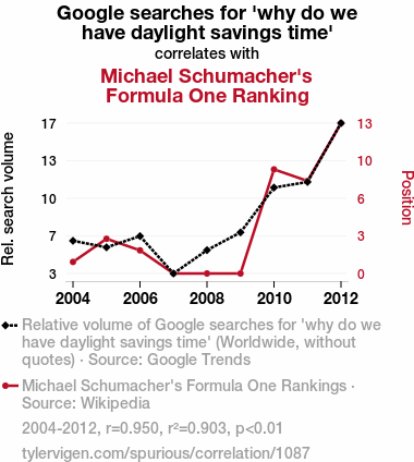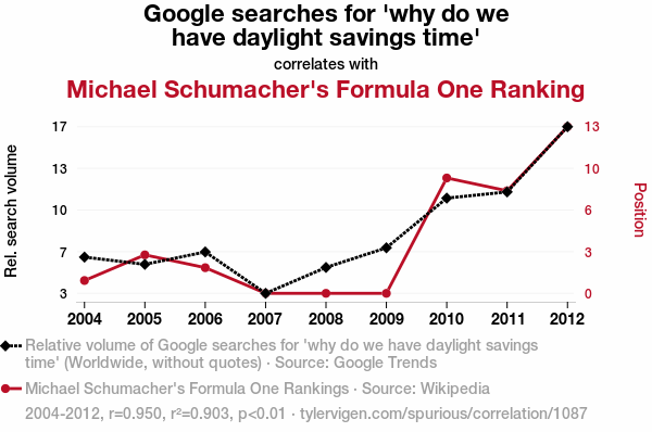 - The spurious research paper: Timing is Everything: The Link between Daylight Savings Time Queries and Schumacher's Formula One Ranking