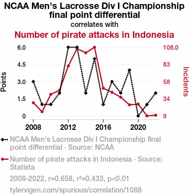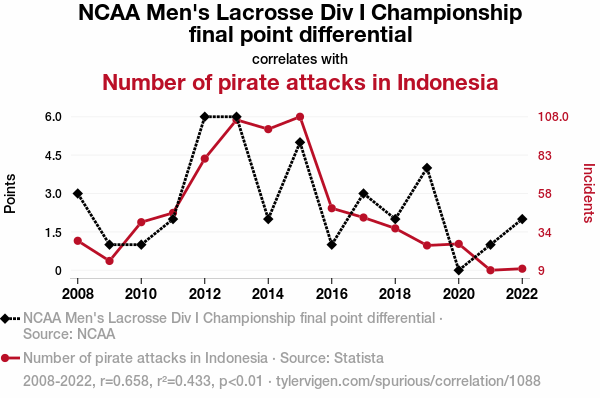 - The spurious research paper: Scoring Goals and Stealing Ships: The Intriguing Relationship Between NCAA Men's Lacrosse Div I Championship Final Point Differential and Pirate Attacks in Indonesia