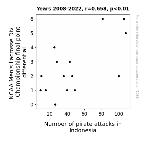 The relationship between seemingly unrelated phenomena has long captivated the attention of researchers across various disciplines. In the realm of statistical analysis, the pursuit of unexpected correlations often yields intriguing findings. As such, our investigation into the correlation between NCAA Men's Lacrosse Div I Championship final point differentials and pirate attacks in Indonesia builds upon the foundation of scholarly inquiry into seemingly disparate variables.