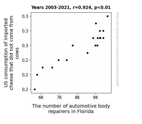 This means 85.3% of the change in the one variable (i.e., The number of automotive body repairers in Florida) is predictable based on the change in the other (i.e., US consumption of imported cheese that did not come from cows) over the 19 years from 2003 through 2021.