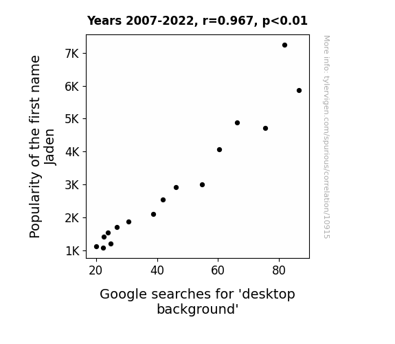 This means 93.5% of the change in the one variable (i.e., Google searches for 'desktop background') is predictable based on the change in the other (i.e., Popularity of the first name Jaden) over the 16 years from 2007 through 2022.