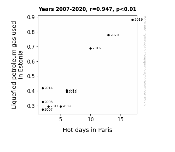 This means 89.7% of the change in the one variable (i.e., Hot days in Paris) is predictable based on the change in the other (i.e., Liquefied petroleum gas used in Estonia) over the 10 years from 2007 through 2020.
