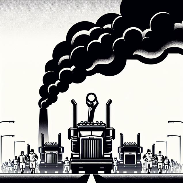 ChatGPT: Generate an image of the Boston Red Sox championship parade as a minimalist illustration. Show a line of sleek, monochromatic diesel trucks roaring down the highway, emitting stylized dark fumes that blend into the victorious Red Sox team as they parade triumphantly, holding up their championship trophy. Use minimalistic shapes and forms to convey the energy and determination of the team, leaving their opponents trailing behind in the background.