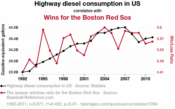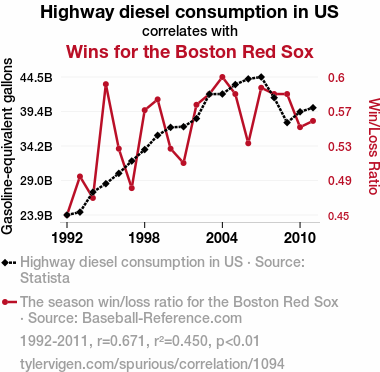 - The spurious research paper: Highway to Home Plate: A Correlational Analysis of Highway Diesel Consumption in the US and Wins for the Boston Red Sox
