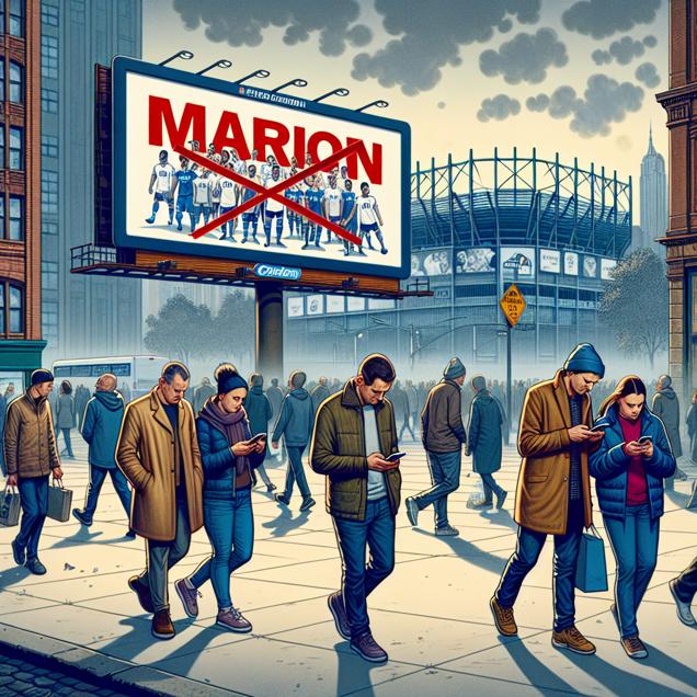 Prompt: Generate an image of a vibrant city street bustling with activity, featuring a prominent billboard bearing the name "Marion" crossed out in bold red. The scene captures a group of dejected Pittsburgh Pirates fans walking past the billboard, their somber expressions evident as they check their phones for updates. In the backdrop stands the tranquil and empty stadium of the team, serving as a poignant reminder of their disappointment. The depiction should include only scenes, people, and objects, it should not include text or speech bubbles.