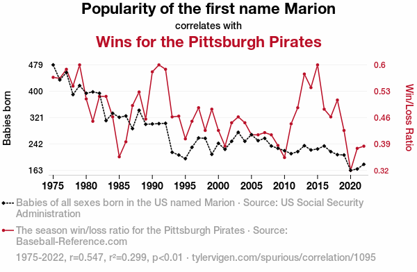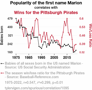 - The spurious research paper: Marion the Barbarian: An Examination of the Relationship Between the Popularity of the Name Marion and the Pittsburgh Pirates' Wins