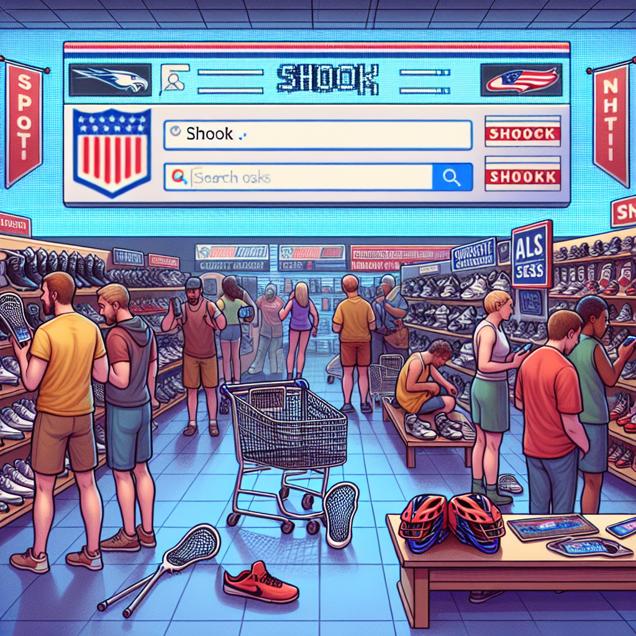 ChatGPT: Prompt: Generate an image representing a sports equipment store in a cyber folk style. On one end, display a prominent sign announcing the National Lacrosse Champions' Final Point with a clear decrease in the number. On the opposite end, depict a row of phones with the word 'shook' typed into the search bar, accompanied by a visible decrease in the number of searches. The items in this area appear slightly less touched and pushed aside, suggesting a decreased demand. The collective disappointment is evident as a group of people discusses the champions' performance. Capture the atmosphere of diminished interest and anticipation, amplifying the impact of the decreasing final point on related events and products in the store.