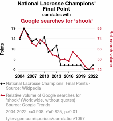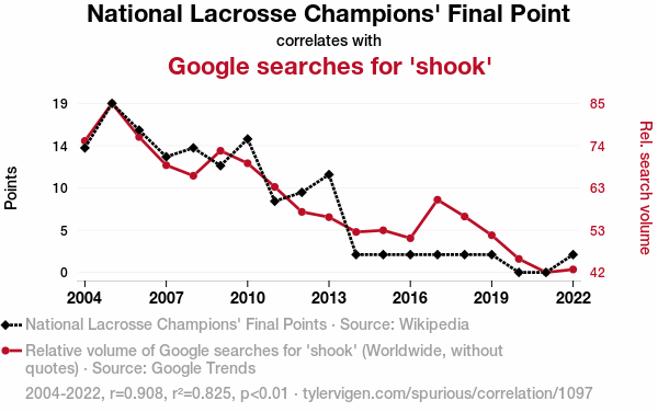 User prompt: Please provide potential search keywords for a paper titled Stick It to Me: The Final Point of National Lacrosse Champions and the Shook Google Searches Connection with an abstract of This paper presents a comprehensive analysis of the perplexing correlation between the final point scored by the National Lacrosse Champions and the frequency of Google searches for the term "shook". Using data extracted from Wikipedia and Google Trends, we conducted a thorough investigation covering the years 2004 to 2022. Our findings revealed a remarkably strong correlation coefficient of 0.9080987 and a statistically significant p-value of less than 0.01, providing compelling evidence of the connection between these seemingly unrelated phenomena. It's almost like they were caught in a "lacrosst" connection! Our study sheds light on this quirky relationship, offering valuable insights into the interconnectedness of sports victories and internet search behavior. We also couldn’t resist a good father's joke by saying that these results have, quite literally, left us "shook"!