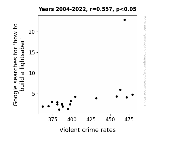 This means 31% of the change in the one variable (i.e., Violent crime rates) is predictable based on the change in the other (i.e., Google searches for 'how to build a lightsaber') over the 19 years from 2004 through 2022.