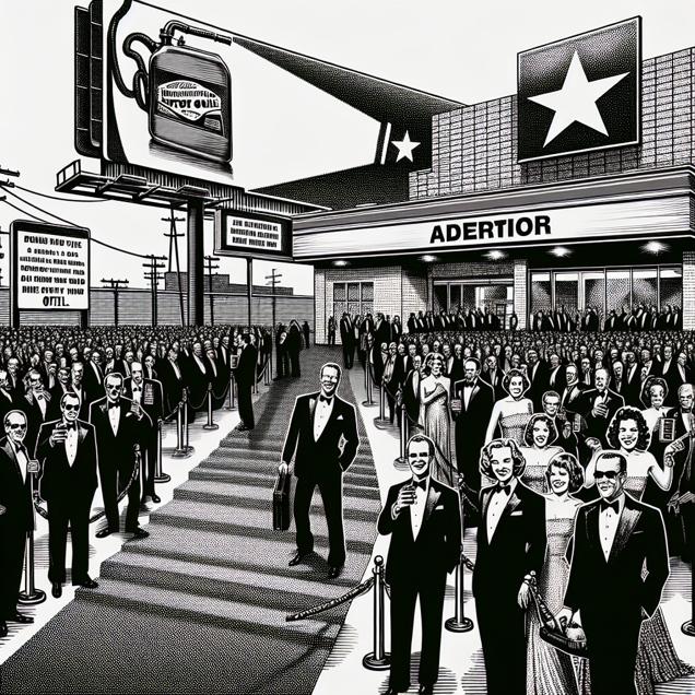 ChatGPT: Generate an image in the style of a black-and-white newspaper illustration. Show a bustling Hollywood red carpet event with celebrities lining the venue. Nearby, depict a Valero Energy gas station with a newly installed "Movie Star Motor Oil" sign. In the background, a 30-second ad commercial for the premiere of a blockbuster film is playing on a large billboard, and the average cost of advertising during the Academy Awards is visibly increasing. Make sure the visual depiction is simple without any words or speech bubbles.