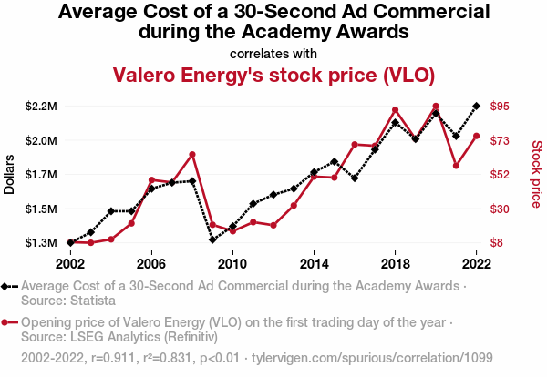 "Oscar ad costs," "Valero Energy stock price correlation," "correlation between Academy Awards and stock market," "economic impact of Oscars advertising," "entertainment industry and oil market connection," "media advertising influence on stock prices," "Hollywood and energy sector correlation," "Academy Awards commercial costs and stock market correlation," "economic impact of film industry events on oil prices," "Oscar ad commercial cost analysis," "film industry advertising and stock market relationship."