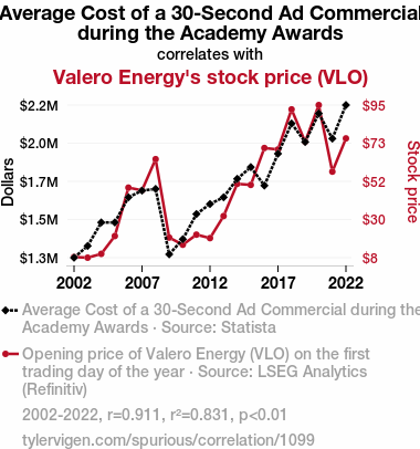 - The spurious research paper: Oil Be There for You: The Crude Connection Between Oscar Ad Costs and Valero Energy's Stock Price