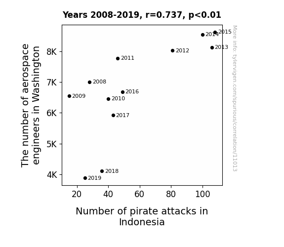 This means 54.4% of the change in the one variable (i.e., Number of pirate attacks in Indonesia) is predictable based on the change in the other (i.e., The number of aerospace engineers in Washington) over the 12 years from 2008 through 2019.