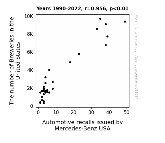 This means 91.4% of the change in the one variable (i.e., Automotive recalls issued by Mercedes-Benz USA) is predictable based on the change in the other (i.e., The number of Breweries in the United States) over the 33 years from 1990 through 2022.