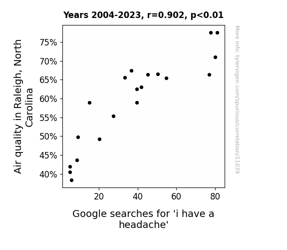 This means 81.4% of the change in the one variable (i.e., Google searches for 'i have a headache') is predictable based on the change in the other (i.e., Air quality in Raleigh, North Carolina) over the 20 years from 2004 through 2023.