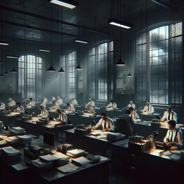 Prompt: Create an image of a TIME magazine cover featuring a solemn, dimly lit IRS office scene. The office shows empty desks and a few remaining tax examiners and collectors diligently engaged in their work. The atmosphere is heavy with a sense of desolation and weariness. The remaining employees are depicted as determined and vigilant, with a hint of concern in their expressions. Outside the windows, dark storm clouds loom ominously, reflecting the looming threat of consequences for tax evasion. The cover captures the contrast between the eerie emptiness of the office and the intensity of the few remaining workers, subtly conveying the message of the consequences of unethical tax avoidance. The depiction should include only scenes, people, and objects, it should not include text or speech bubbles.