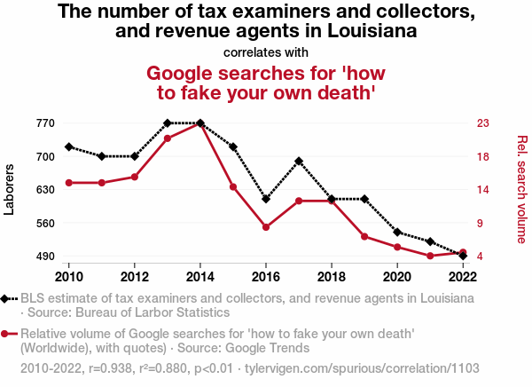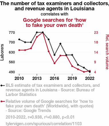 Louisiana, tax examiners, tax collectors, revenue agents, Google searches, fake your own death, correlation coefficient, p-value, Bureau of Labor Statistics, Google Trends, fiscal responsibility, mortal demise, tax-related professionals, macabre curiosity, mortality, dark humor