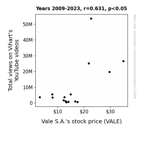 This means 39.8% of the change in the one variable (i.e., Vale S.A.'s stock price (VALE)) is predictable based on the change in the other (i.e., Total views on Vihart's YouTube videos) over the 15 years from 2009 through 2023.