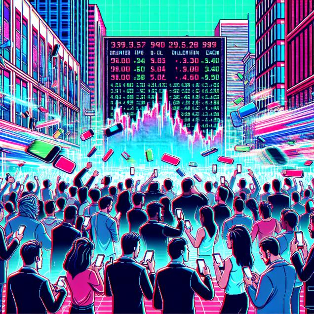 Prompt: Prompt for DALL-E-3: Generate an image of a glitch art style rendering of a bustling city scene. In the foreground, depict a group of perplexed investors gathered around a large electronic billboard displaying fluctuating stock prices of Coca-Cola. Show the investors with their confused expressions, and in the background, illustrate a wave of people vigorously typing 'Who is JK Rowling' into their smartphones. Emphasize the contrast between the investors' puzzled expressions and the crowd's curious search activity. Capture the tangible excitement in the air and hint at the surge in searches for JK Rowling and the concurrent rise in Coca-Cola stock price. The depiction should include only scenes, people, and objects, it should not include text or speech bubbles.