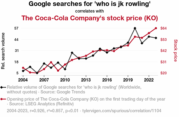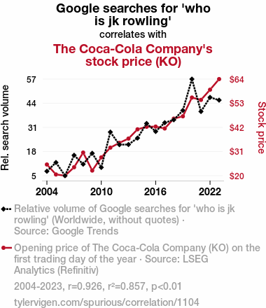 "who is J.K. Rowling" search trends, Coca-Cola stock prices, Google Trends data analysis, LSEG Analytics (Refinitiv), correlation coefficient in data analysis, unexpected relationships in data analysis, pop culture and stock market correlation, "who is J.K. Rowling" search and Coca-Cola stock prices, curious correlations in data analysis
