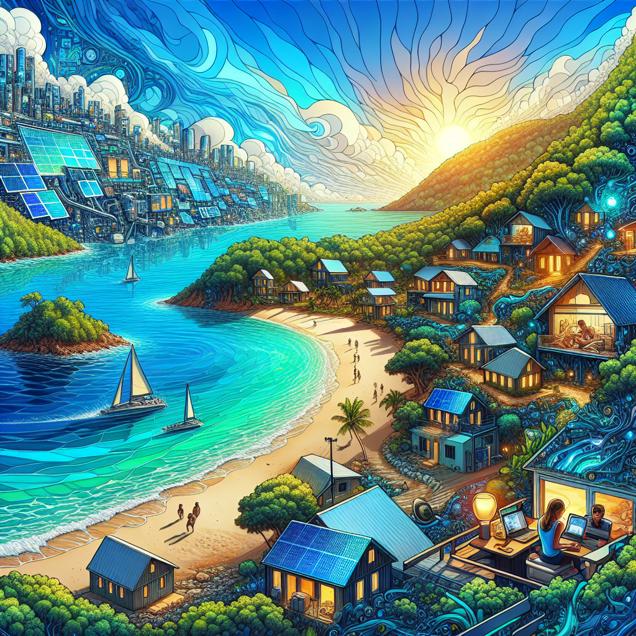 User prompt: Please respond with an image generation prompt that would be likely to create an interesting visual using DALLE-3, using the following style: [ Cyber folk ] and depicting this scene: Imagine a tranquil scene on the British Virgin Islands, with gentle waves lapping against the sandy shore. In the background, a row of solar panels sparkles in the sunlight, generating electricity. Meanwhile, in cozy island homes, residents sit at their laptops, curiously typing "Bing" into the search bar, their eyebrows raising in surprise as they discover the search engine. This collective action seems to power up the island, creating a surge in electricity generation. Keep the visual depiction simple. Do not include any words or speech bubbles.