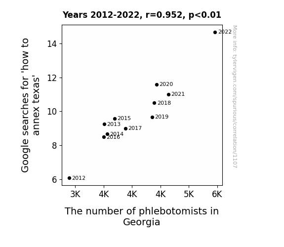 This means 90.7% of the change in the one variable (i.e., The number of phlebotomists in Georgia) is predictable based on the change in the other (i.e., Google searches for 'how to annex texas') over the 11 years from 2012 through 2022.
