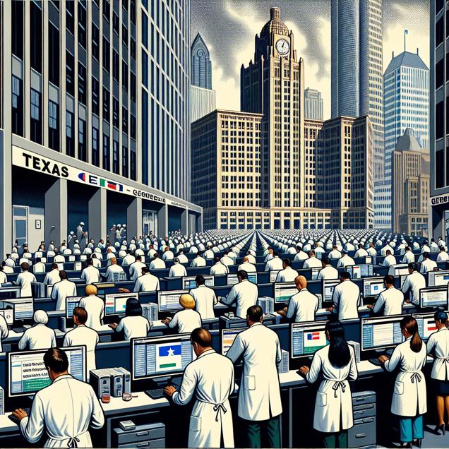 ChatGPT: In a crowded Texas office building, people huddle around their computers with "how to annex texas" searches on their screens. Meanwhile, a line of phlebotomists can be seen heading towards Georgia, their lab coats fluttering as they migrate to meet the increasing demand for their services.