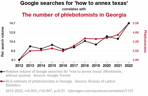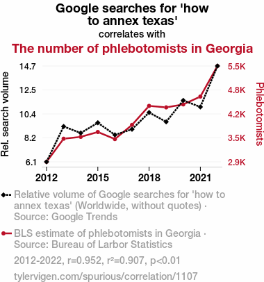 - The spurious research paper: Drawing Bloodlines: The Correlation Between Google Searches for 'How to Annex Texas' and the Number of Phlebotomists in Georgia