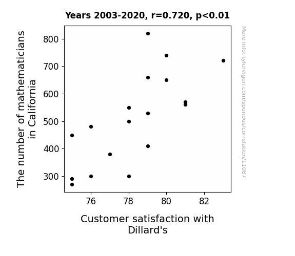 This means 51.9% of the change in the one variable (i.e., Customer satisfaction with Dillard's) is predictable based on the change in the other (i.e., The number of mathematicians in California) over the 18 years from 2003 through 2020.