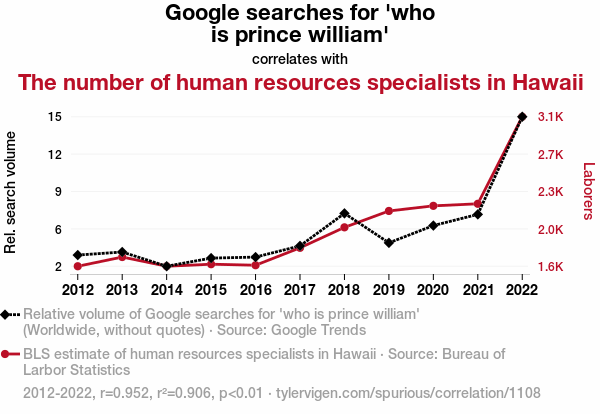 - The spurious research paper: The Royally Googled Connection: Unveiling the Correlation Between Google Searches for Who is Prince William and the Number of Human Resources Specialists in Hawaii
