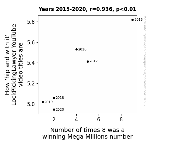 This means 87.7% of the change in the one variable (i.e., Number of times 8 was a winning Mega Millions number) is predictable based on the change in the other (i.e., How 'hip and with it' LockPickingLawyer YouTube video titles are) over the 6 years from 2015 through 2020.