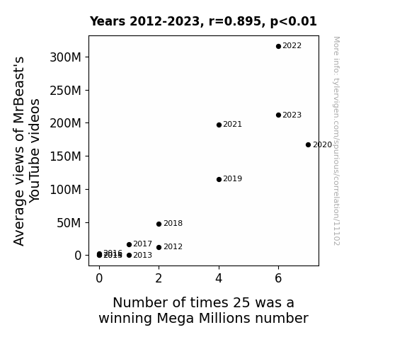 This means 80.1% of the change in the one variable (i.e., Number of times 25 was a winning Mega Millions number) is predictable based on the change in the other (i.e., Average views of MrBeast's YouTube videos) over the 12 years from 2012 through 2023.