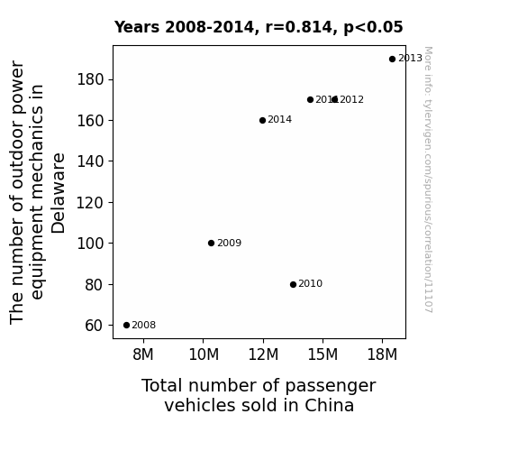 This means 66.2% of the change in the one variable (i.e., Total number of passenger vehicles sold in China) is predictable based on the change in the other (i.e., The number of outdoor power equipment mechanics in Delaware) over the 7 years from 2008 through 2014.