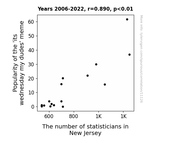 This means 79.2% of the change in the one variable (i.e., The number of statisticians in New Jersey) is predictable based on the change in the other (i.e., Popularity of the 'its wednesday my dudes' meme) over the 17 years from 2006 through 2022.