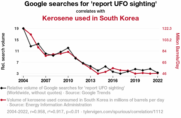 - The spurious research paper: Bright Lights, Big Ignition: Unearthing the Link Between Google Searches for 'Report UFO Sighting' and Kerosene Consumption in South Korea