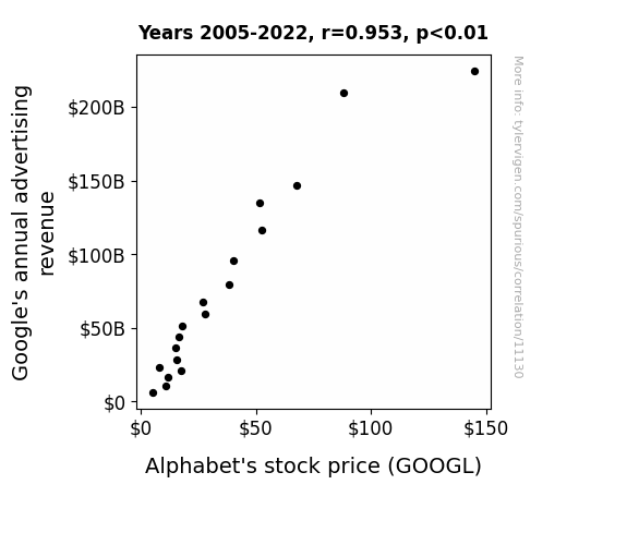 This means 90.8% of the change in the one variable (i.e., Alphabet's stock price (GOOGL)) is predictable based on the change in the other (i.e., Google's annual advertising revenue) over the 18 years from 2005 through 2022.