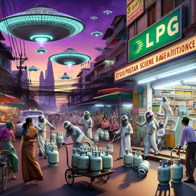 ChatGPT: Imagine a picturesque scene of a bustling LPG gas station in Thailand, with UFOs zipping by in the sky. The gas station is filled with rows of shiny propane tanks, while a group of friendly aliens with glowing eyes and shimmering metallic suits are gleefully wheeling carts full of LPG cylinders into their spaceship. Nearby, a group of humans watches in amazement as the aliens load up their spaceship with propane, ready for their intergalactic journey.