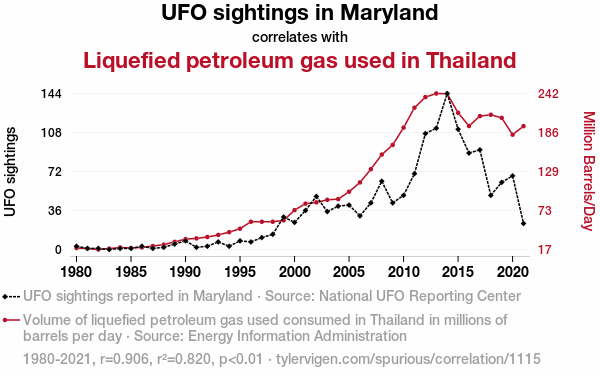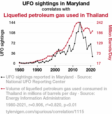 This means 82% of the change in the one variable (i.e., Liquefied petroleum gas used in Thailand) is predictable based on the change in the other (i.e., UFO sightings in Maryland) over the 42 years from 1980 through 2021.