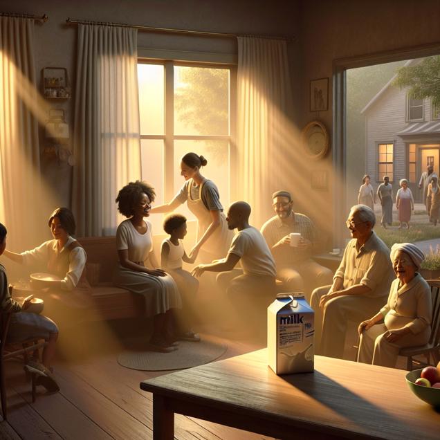 User prompt: Please respond with an image generation prompt that would be likely to create an interesting visual using DALLE-3, using the following style: [ Concept art ] and depicting this scene: In the first scene, we see a carton of milk being left untouched on a kitchen table. Next, we see a group of people sitting comfortably, not experiencing any stomach discomfort. This leads to a peaceful atmosphere in the room, with everyone having relaxed expressions on their faces. Finally, we see a town with happy citizens going about their day, and there is a noticeable absence of any criminal activity such as robberies taking place. Keep the visual depiction simple. Do not include any words or speech bubbles.