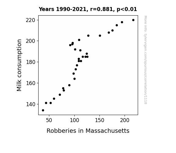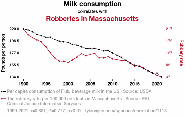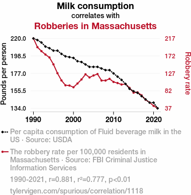 - The spurious research paper: Got Milf? Exploring the Udderly Surprising Relationship Between Milk Consumption and Robberies in Massachusetts