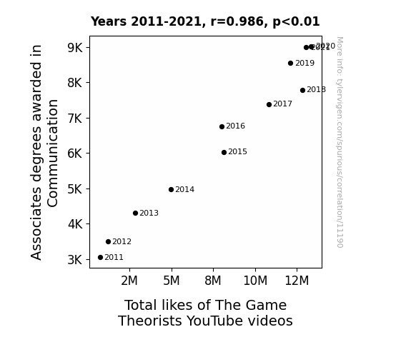 This means 97.3% of the change in the one variable (i.e., Total likes of The Game Theorists YouTube videos) is predictable based on the change in the other (i.e., Associates degrees awarded in Communication) over the 11 years from 2011 through 2021.