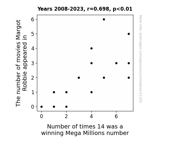 This means 48.7% of the change in the one variable (i.e., Number of times 14 was a winning Mega Millions number) is predictable based on the change in the other (i.e., The number of movies Margot Robbie appeared in) over the 16 years from 2008 through 2023.