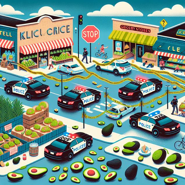 User prompt: Please respond with an image generation prompt that would be likely to create an interesting visual using DALLE-3, using the following style: [ Whimsical illustration ] and depicting this scene: In a visual scene, we see an increase in motor vehicle thefts in Kentucky, indicated by more police cars patrolling the streets and caution tape surrounding parking lots. At the same time, we witness an influx of Google searches for avocado toast on people's computer screens and mobile devices. Meanwhile, the grocery stores are filled with crates of avocados, and on the streets, there are avocados scattered around as clumsy thieves drop them while fleeing. In cafes and kitchens, people are busy spreading avocado on toast, with many patrons and chefs excitedly creating and devouring the trendy dish. Keep the visual depiction simple. Do not include any words or speech bubbles.