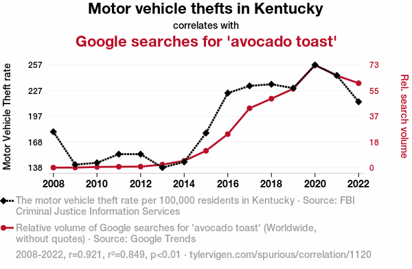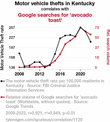 - The spurious research paper: Guac and Roll: The Avo-Crime Connection - An Examination of Motor Vehicle Thefts in Kentucky and Google Searches for 'Avocado Toast'