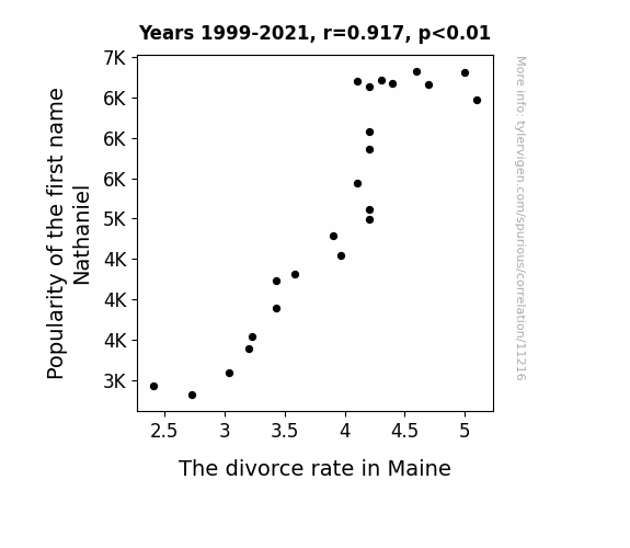 This means 84% of the change in the one variable (i.e., The divorce rate in Maine) is predictable based on the change in the other (i.e., Popularity of the first name Nathaniel) over the 23 years from 1999 through 2021.