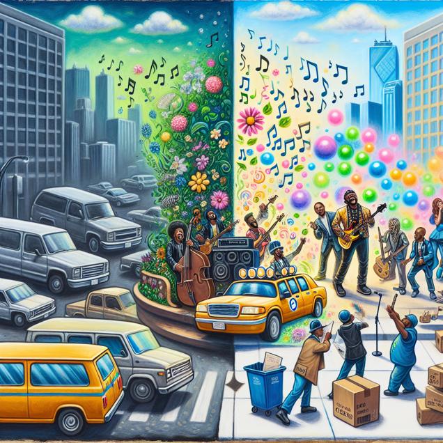 ChatGPT: [ Whimsical illustration ] - Generate an atmospheric illustration of a bustling downtown Dallas street scene. The focus is on the transformation of the environment: from a bustling, polluted street to a more serene, cleaner atmosphere. Capture the transition by showcasing fewer emissions from cars, symbolized by whimsical, playful visuals of vehicles emitting flowers or bubbles instead of harmful gases. Include bright, vibrant colors to depict the positive change in air quality. Meanwhile, at the recording studio, showcase the lively, upbeat energy of the musicians as they set up for a live performance - perhaps with musical notes dancing around them. Across the street, illustrate the mail carrier loading fewer packages onto their van, indicating the decrease in physical album shipments, such as by showcasing a reduction in the size or number of the packages. The focus should be on the optimism and excitement of the musicians as they prioritize their upcoming live performance over physical album production, symbolized by confident expressions, smiles, and high-fives exchanged between them. Create a sense of camaraderie and celebration as the scene exudes a feeling of positive change and artistic freedom.