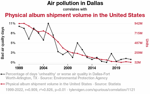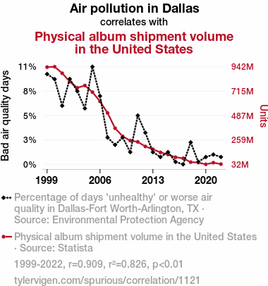 - The spurious research paper: The Ailments of Air: A Correlation Between Poor Air Quality in Dallas and Physical Album Shipment Volume in the United States