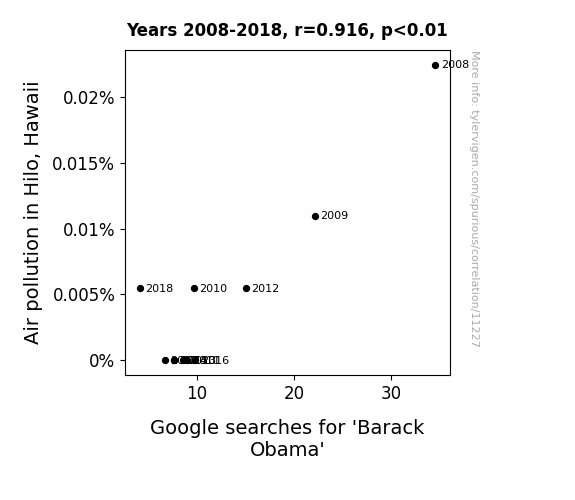 This means 84% of the change in the one variable (i.e., Google searches for 'Barack Obama') is predictable based on the change in the other (i.e., Air pollution in Hilo, Hawaii) over the 11 years from 2008 through 2018.