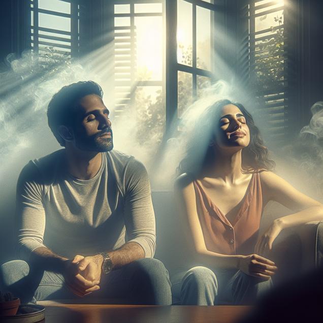 Prompt: The cozy living room is illuminated with warm, soft light as the couple sits facing each other. Their expressions are initially strained, with squinting eyes and furrowed brows due to the thick smoke filling the room. Rays of light filter through the hazy air, casting an ethereal glow. As the window opens and a gentle breeze sweeps inside, the smoke begins to disperse, revealing a clear, bright blue sky outside. The couple's features gradually soften, and their smiles emerge as they inhale deeply, savoring the refreshing, clean air. The room transforms, becoming filled with a sense of relief and tranquility, and the couple's body language eases into an embrace, conveying a newfound sense of joy and connection. The depiction should include only scenes, people, and objects, it should not include text or speech bubbles.